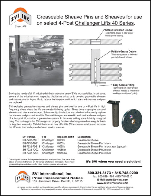 Greaseable Sheave Pins and Sheaves for use on select 4-Post Challenger Lifts 40 Series