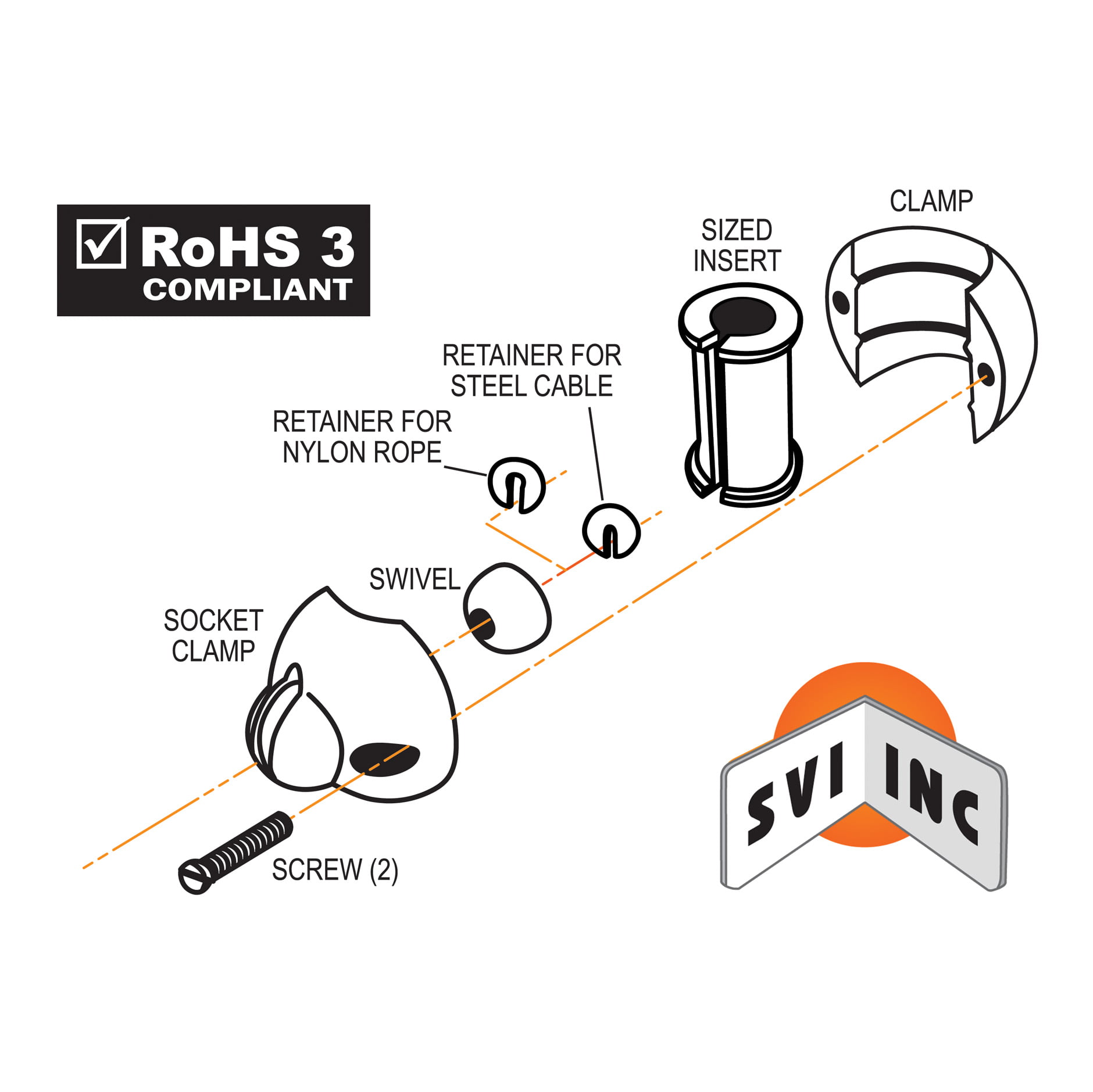 SVI cable clamps are made of a high-quality black nylon material that resists the elements. Each clamp is free rotating, preventing the cable and retractor cable from binding or twisting. All clamp kits come individually packaged with all the necessary hardware along with an installation diagram.