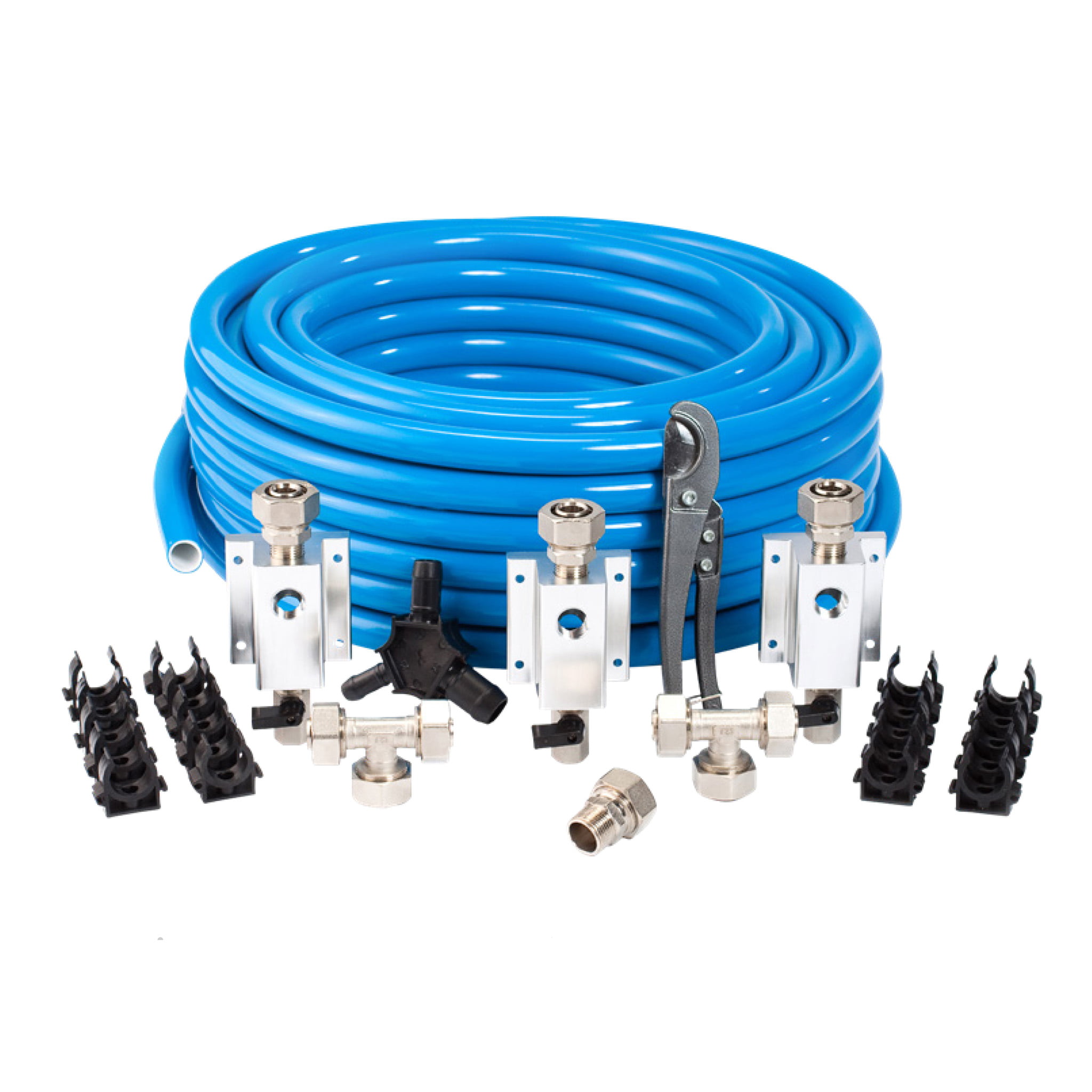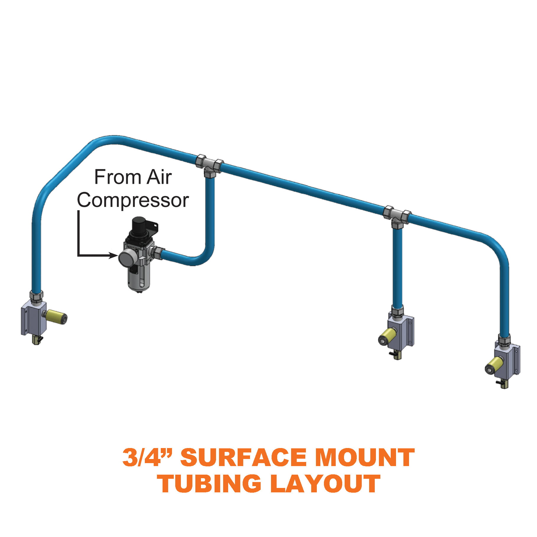 Set up a compressed air system with the 3/4 in. MaxLine Master Kit with 3 air outlet locations. The Max Line Semi-Flexible Compressed Air Tubing has an aluminum core sandwiched between an inner and outer layer of polyethylene. Tubing holds any hand bent shape. Reduce shop clutter with this industrial compressed air piping system. No glue, soldering or crimping needed. Simply cut the tubing to length, insert in the fitting and tighten. Easy to expand with more air outlet locations or modify later. Tubing size is 1” OD x 3/4” ID.