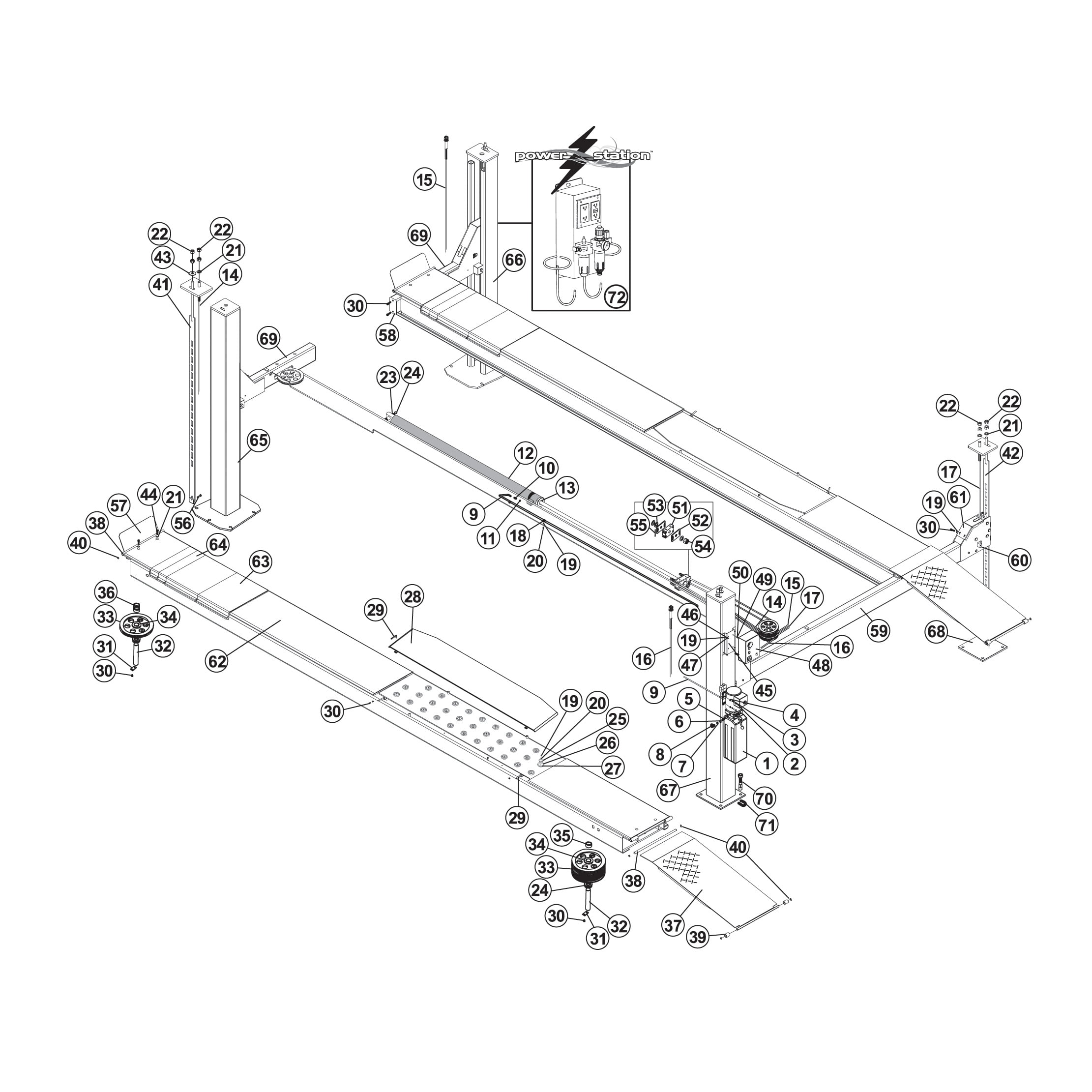 Tuxedo Lift Model FP14KO-A is a 14,000 lb. capacity four-post open front alignment lift, cable driven. Repair parts are available.